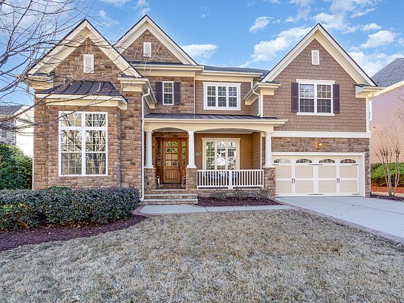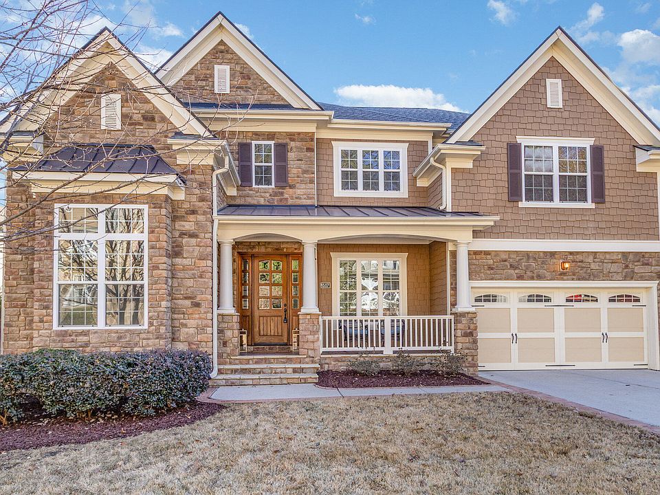Former Parade of Homes Winner in Prime NW Raleigh Location! Situated near the end of a cul-de-sac and perfectly positioned between Brier Creek and Crabtree Valley Mall—just minutes from RDU Airport—this stunning stone-front residence showcases timeless craftsmanship and elegant design. Featuring 4 bedrooms and 3.5 baths, this home offers hardwood floors throughout the main level, extensive millwork, and beautiful architectural details. Enjoy both formal living and dining areas, with the living room (or office) highlighted by a coffered ceiling. The two-story family room provides an open, airy feel, while the spacious gourmet kitchen features granite countertops, a center island, and stainless steel appliances—perfect for cooking or entertaining. The first-floor primary suite offers comfort and convenience, while the second floor includes a sunken bonus room with surround sound, plus an additional recreation room for flexible use. Step outside to a screened-in porch, a large outdoor patio, and a built-in stone outdoor fireplace, creating an ideal setting for outdoor living and gatherings. The backyard is fully fenced and private. Additional upgrades include a new roof (2024), new carpet, a 2-car garage, and a fully insulated crawl space. An award-winning design in one of Raleigh's most desirable areas—this home truly has it all!