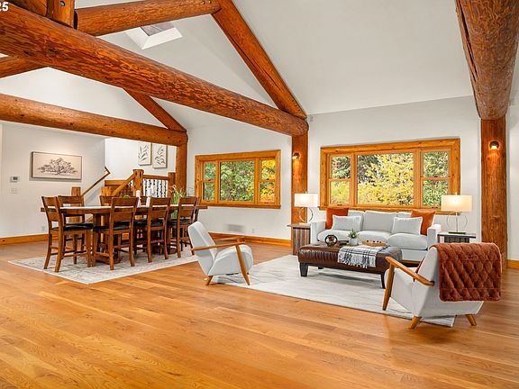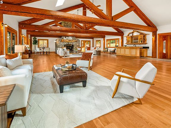 Nestled on 20 acres sits this remarkable home, overflowing with stunning craftsmanship and presenting itself as a one of a kind private retreat just minutes to town. Built-in 2010, the expansive great room features beautiful hardwood floors, vaulted open beam ceilings, built-in wet bar and a majestic, river stone fireplace. An abundance of windows and skylights provide ample light and picturesque views of nature and the surrounding trees. The chef's kitchen boasts beautiful granite counters, Chinquapin cabinets, large island with sink, eating bar and gas cooking. The spacious primary suite features a separate sitting area, walk-in closet with built-ins and a large soaking tub. Multiple covered patios offer the perfect place to relax and enjoy the peace and quiet, or host and entertain your guests. In addition you'll find a huge 2400 sq ft garage/shop with a separate 600 amp electrical service and an RV door that allows for up to 8 cars! Perched near the top of Forest Hill with open sunny meadows, old growth forests and expansive skies, this lovely setting offers endless possibilities to create your dreams. All located less than 10 minutes to Eugene with absolute privacy from neighbors, this amazing property is truly a rare find! OPEN HOUSE 11/16 Sun 1-3, or contact your agent today to schedule an appt to view.