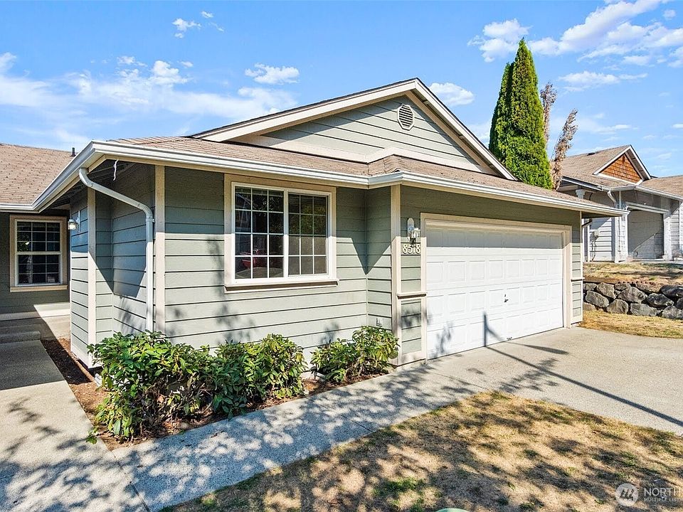 Move-in ready rambler with a welcoming tile entry opens to a spacious vaulted living and dining area featuring a cozy gas fireplace, and sliding doors to rear deck. The kitchen boasts abundant counter space, low-maintenance laminate surfaces, warm honey oak cabinetry, a oven, and generous storage. The primary suite includes a full bath and walk-in closet, with two additional bedrooms, a full guest bath, and laundry room complete the interior. Outside, enjoy a fully fenced backyard with an entertainer’s deck, patio, and lawn area below the slope. Attached 2-car garage plus driveway parking. It is conveniently located just minutes from I-5, JBLM, shopping, parks, trails, and the Regional Athletic Complex!