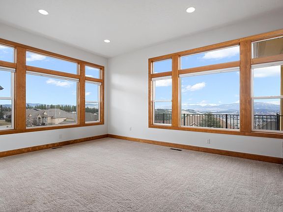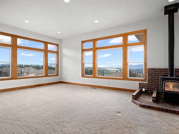 This custom-built home, perched atop North Wood, offers stunning, unobstructed views of East Spokane, Spokane Valley, Mica Peak, Arbor Crest, and more. Designed with comfort and luxury in mind, the main floor features soaring 10-foot ceilings, while the lower level offers generous 9-foot ceilings. The gourmet kitchen opens seamlessly into an expansive great room, complete with both a wood-burning stove and a gas fireplace—perfect for cozy evenings. The main level includes a spacious primary suite and three additional bedrooms, one of which features floor-to-ceiling bookshelves, ideal for a library or study. Downstairs, enjoy panoramic views, a fourth bedroom, a full bath, a dedicated wine cellar, and an oversized workout room with rubber flooring and abundant storage space. The home also boasts a fully finished 4-car garage with impressive 11-foot ceilings, providing ample room for vehicles, hobbies, and more.
