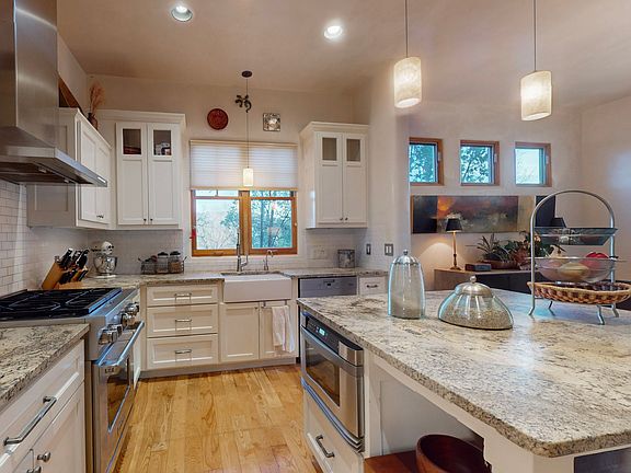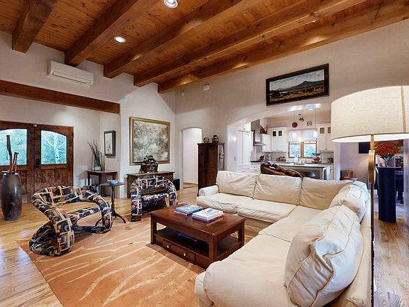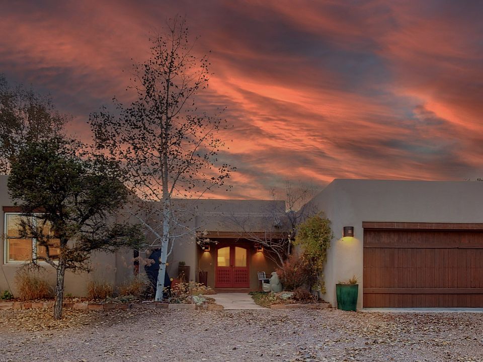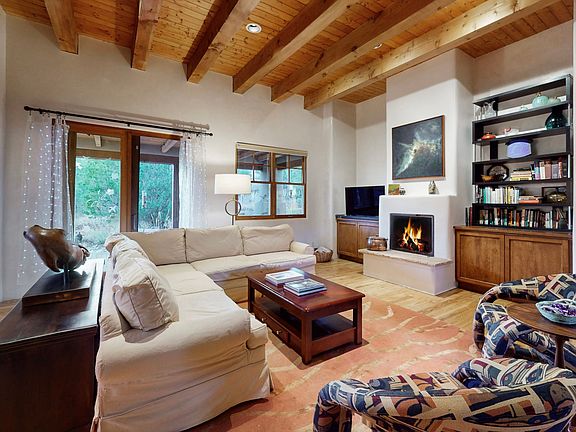 This lovely 3 bedroom, 2 bath 2000+- sq ft ‘condominium’ with a single family feel is perched at the top of a small hill in a gorgeous little semi-rural enclave a mere 5 minutes drive to the Plaza. Traditional style combines with a modern, European sensibility in this 4 unit association. Features include open concept, split floorplan (not one step), plaster walls in living, dining, and master, pretty and efficient cook’s kitchen with Wolf and SubZero appliances, granite slab counters, vigas, wide plank wood and stone floors, Rumford fireplace plus rear outdoor kiva fireplace and patio, spacious master suite with fireplace. Walk outs to exteriors from all rooms save the guest bedroom. Well-finished, 2 car garage with a mini split system (not included in sq ft) would make a lovely studio. Fully fenced. Sweetly framed Sangres views finish the package. All this a quick walk or bike-ride to every downtown amenity.