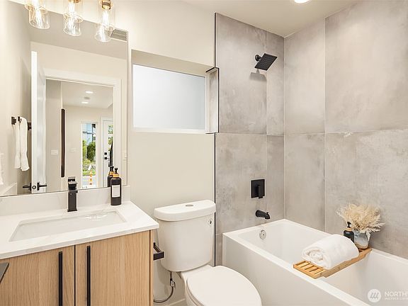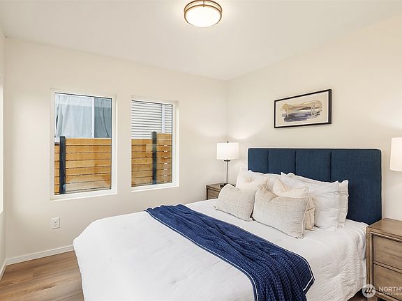 Fresh, modern design meets everyday comfort in this new home by New City Homes. Unmatched yard space hard to find with new construction homes in Ballard. Main level includes 1 bedroom with full bath plus bonus room, offering flexible space for guests, work, or hobbies. Upstairs features a bright living area with open-concept kitchen and dining. Top floor holds a private primary suite, creating a quiet retreat. Enjoy sweeping views of Olympic Mountains and downtown skyline from the rooftop deck. Easy access to restaurants, shops, and parks in Ballard, Phinney Ridge, and Green Lake.