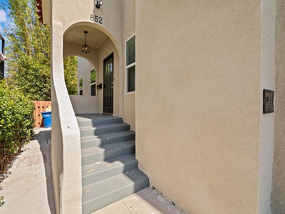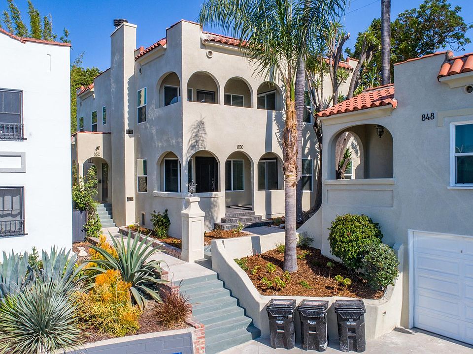 Your opportunity is here to enjoy the updated throughout top floor home with easily accessible inviting common backyard in this Melrose Hill historic district Spanish Triplex. Privately set back from the cul de sac includes spacious floor plan with incredible views of the Hollywood Hills from the living room with gas fireplace, formal dining, and private porch. Large kitchen with quartz countertops and subway tile backsplash, separate laundry room with stackable washer/dryer. Generous size bedrooms share hallway bathroom with walk-in shower. Central air and one car garage with additional second car parking tandem behind makes this your new Hollywood home.