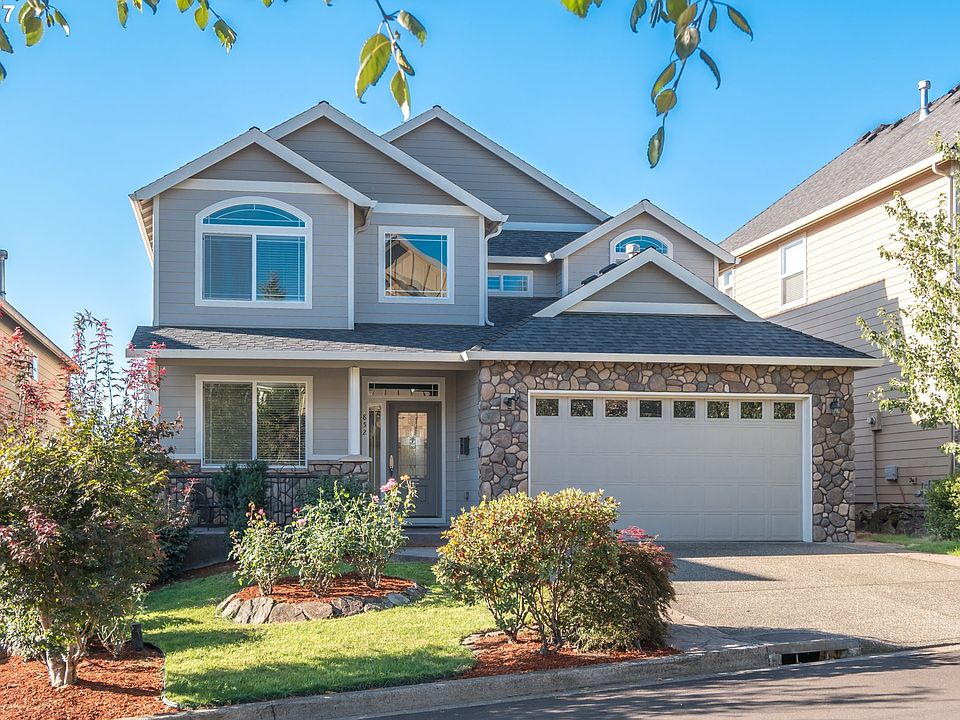 Stunning view home with sunny southern exposure with views of the Columbia River, Mount Hood & city lights. High-end custom home neighborhood & Camas Schools. Wonderful southern exposure & high-end throughout. Exterior has been freshly painted, brand new carpeting installed. Partially covered Trex deck with aluminum railings, sprinkler system & full fencing. Covered front porch with stained & stamped concrete.