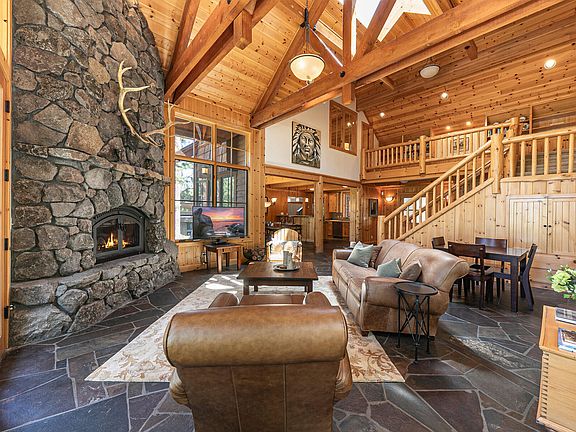 Arrive via a gently sloping driveway with parking for up to three cars outside and two more in the spacious garage, where you'll also find a ping pong table for off-slope entertainment. A wide, wood-framed front door welcomes you into a striking entryway with exposed wood beams, vintage artwork, and tree-trunk banisters that set the tone for this elegant alpine getaway. Natural light pours in through skylights, highlighting the soaring ceilings and warm finishes throughout the home.