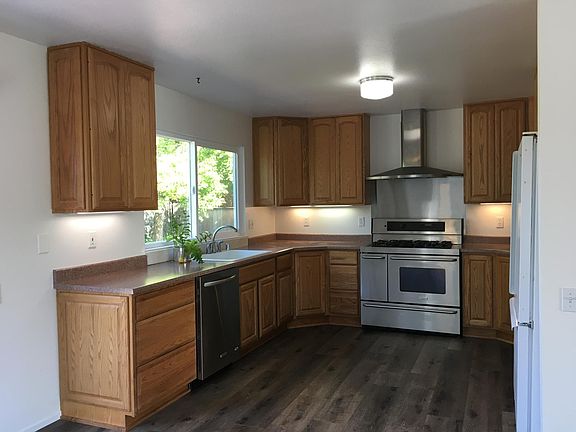 Ideally located directly across from Ladybug Park, this home is walking distance to downtown Cotati, Oliver's Market and the Cotati SMART train station. It is recently renovated including double pane windows, paint and new flooring ( modern vinyl plank in main living area, carpeted bedrooms, tile bathrooms). Living room, dining area and kitchen are open plan with plenty of sunlight. The master bedroom has en suite bathroom. Of the three other bedrooms, one is midsized and two are slightly smaller. Relaxing back garden with newer patio and deck. Refrigerator, dishwasher and double oven gas range included. Tenants responsible for utilities, water, sewage and garbage. 1 year lease. No smoking or drugs on premises. Co-signer ok.