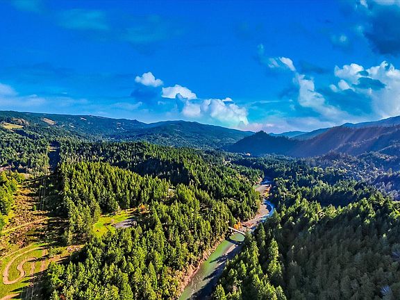 Extraordinary 116-acre homestead with chef's kitchen: Blue Vogal granite, custom maple & cherry cabinets, island, dual ovens, 5-burner gas stove. Spa master bath with Green Moss marble, redwood vanity, dual showers, body jets, jetted Jacuzzi w/ heat, aromatherapy & chromatherapy. Custom birch laundry with Brazilian granite & LG washer/dryer; built-in office; maple hardwood, slate & tile floors; efficient forced heat + fireplace ducting; vertical grain fir windows w/ fiberglass exteriors. 30+ fruit trees, greenhouse, 2 wells, 750k-gal pond, creek & river frontage. Extensive trails, mushroom & berry foraging, graded roads, 2 power meters, 2 RV hookups. Shops: 1,400 sq ft w/ loft, 1,000 sq ft metal shop w/ radiant heat & roll-up doors. 35-40 min from town.