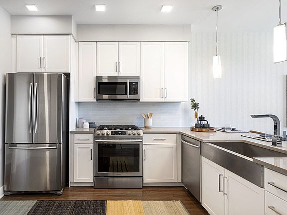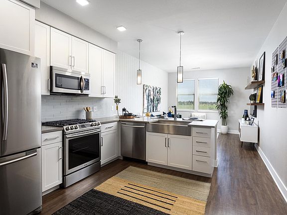 - Exterior features: A quick jaunt to Whole Foods, Trader Joes, Costco, Custom Built-ins, Demonstration Kitchen + Coffee bar, Dog Wash + Pet Amenities, Granite Counters, Hardwood-style Flooring Throughout*, Indoor | Outdoor Entertainment + Gathering, Kitchen Islands in Select Units, Lawn, Open Floor-Plans, Package Receiving, Stainless Steel Appliances, TV Lounge, Tuck-under Garages Available