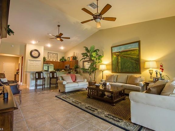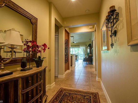 A former builders model with tons of upgrades plus a new microwave and stove in 2018. New A/C and hot water heater in 2019. Second floor condo has cathedral ceiling in the great room and a smart floor plan that seems much larger than it is. From the moment you enter, you will be impressed with the elegant touches and the attention to detail. There is 16" tile in main living areas and carpet in bedrooms. Kitchen has beautiful wood cabinets, stainless appliances and a large pantry. The flex room is currently used as a dining room, but could easily be used as a den or made into a 4th bedroom! Nice to have that choice. Spacious master bedroom, with plantation shutters, dual closets. Master bath has dual sinks and a very large shower. Your laundry room has a sink and quite a few cabinets for additional storage and you also have more storage in the garage. Community pool and spa are within walking distance. View from great room, through the lanai and to a lake across the street.