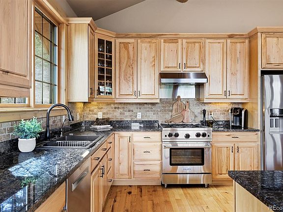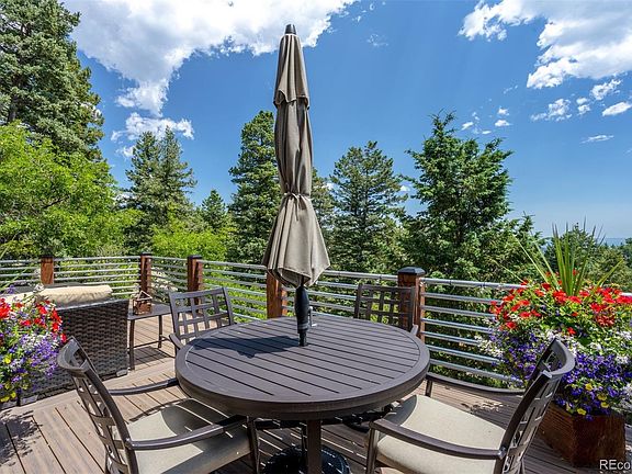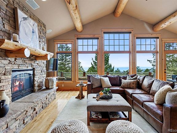 Welcome to your serene mountain sanctuary, nestled amidst towering pines and rugged rock outcroppings, offering sweeping panoramic views of both the mountains and the city. Experience the tranquility of mountain living, just minutes away from the vibrancy of city life. Set on a private acre, this custom-designed mountainside retreat boasts exceptional craftsmanship and modern comforts with rustic charm. The open floor plan features vaulted ceilings, creating an airy and bright atmosphere, while walls of windows capture breathtaking views from every angle. The spacious kitchen is equipped with top-of-the-line appliances, including a Blue Star gas range, warm granite countertops, a center island, and rich hickory cabinetry. It seamlessly flows into the open family and dining areas, anchored by a stunning rock hearth with a gas fireplace and expansive windows framing the remarkable views. Step out onto the brand-new custom wrap-around deck and savor a sunset or stargaze under the twinkling night sky. The main-level primary suite is your personal retreat, featuring a spa-like bath and views of a striking rock waterfall and charming firepit. The lower level offers two generous bedrooms or home office spaces and a well-appointed bath. The oversized garage, with high-quality industrial flooring and ample storage, will easily house all your tools and toys. This home has been meticulously maintained and thoughtfully upgraded, with no expense spared in enhancements. New features include an expansive deck, a Class IV roof, a new AC system, HVAC, water heater, Generac generator, well pump, paved driveway, dual radon system, and new garage doors, among others. Named Selah Place, meaning "Reflect with Peace," this home perfectly blends mountain serenity with urban convenience. It’s just minutes from C-470 and close to Denver, Evergreen, Conifer, and miles of Jefferson County Open Space trails for endless outdoor adventures. Top rated Conifer High School!!!