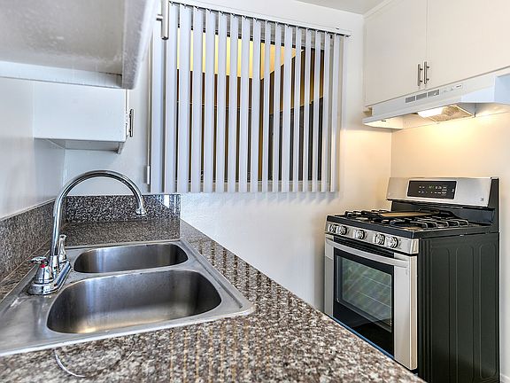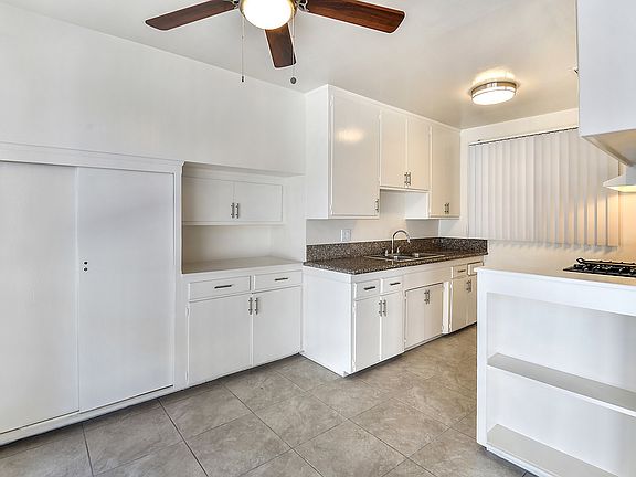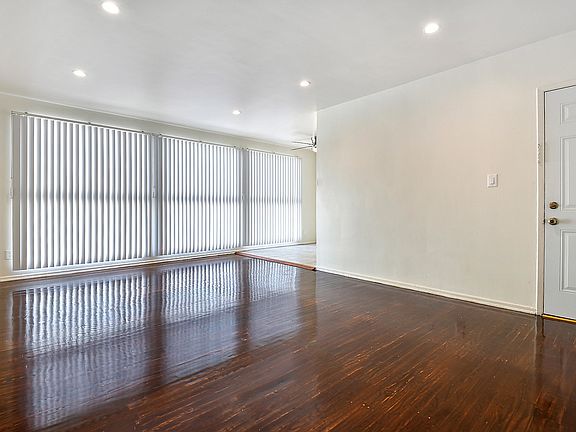 The freshly painted apartment has ceiling fans throughout. The numerous windows are decorated in vertical blinds.
