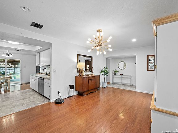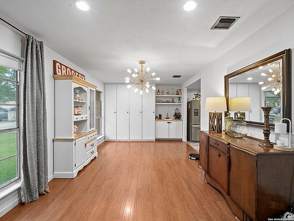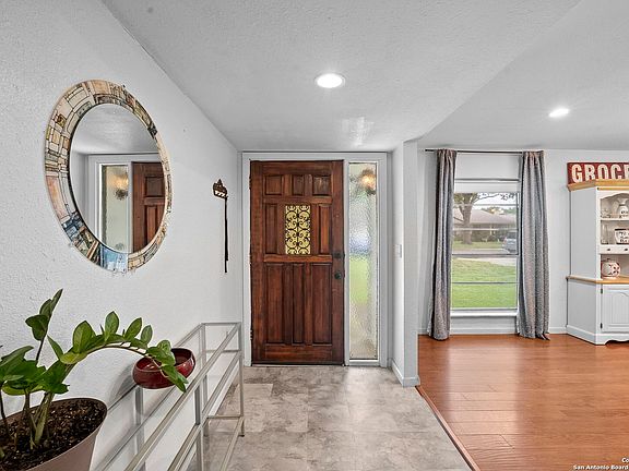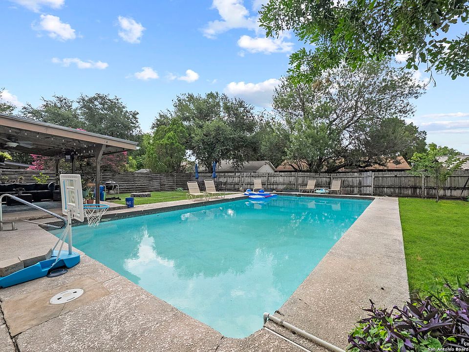 Two-Story Home with Inground Pool Near Bandera & Loop 1604! Offering 1,895 square feet, this well-designed home includes 3 bedrooms and 2 bathrooms. The main level features a comfortable living area with a gas brick fireplace that adds warmth and character, a formal dining room with large windows adding natural light, and an inviting eat-in kitchen equipped with stainless steel appliances and a wet bar. Recessed lighting throughout the main spaces enhances the open and airy feel. The primary suite is conveniently located downstairs and includes a double vanity, separate shower, and a soaking tub. Upstairs, all secondary bedrooms are thoughtfully separated, providing privacy and a split layout. Step outside to a backyard built for enjoyment, complete with a refreshing inground pool with a sand filter, a covered patio for shaded lounging or outdoor dining, a fire pit, and a full privacy fence that creates a secluded setting. Set in a prime area near Loop 1604 and Bandera Road, this home offers easy access to shopping, dining, and entertainment-all while enjoying the comfort an established neighborhood.