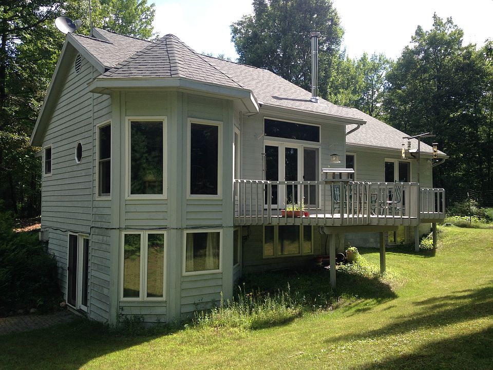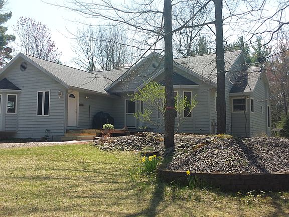 Spacious, bright 4 bedroom home on quiet 5.5 acres with private lake frontage and a pond as well. This beautiful home is close to town and the high school, but has a very quiet, country feel. Inside, enjoy high ceilings, quality construction, an open concept living area, and a large finished lower level with a gas fireplace, bar, and an extra large bedroom. Three bedrooms and an office compliment the main level, with many sunny sitting areas including decks off the family area and master suite. You'll appreciate the newer windows and the clean, spacious mudroom entryway. Outside, enjoy the pond view, swim to the raft on the lake or work in the organic garden. Orchard trees and maple syrup making have been enjoyed here by current owners. 60 x 40 Pole building is perfect for hobbies, storage, or parking.