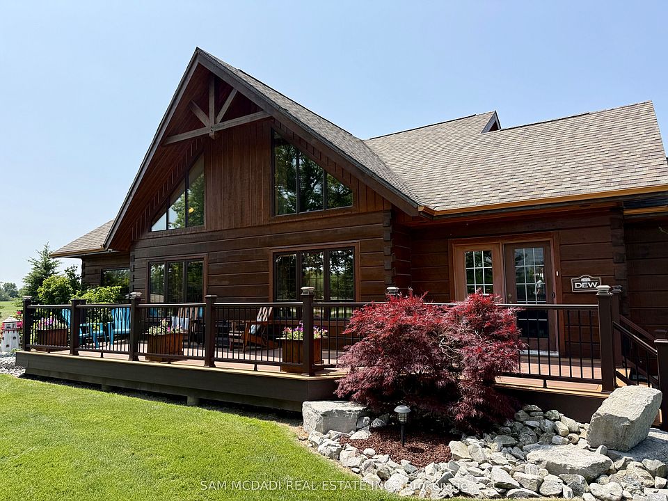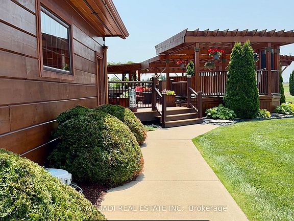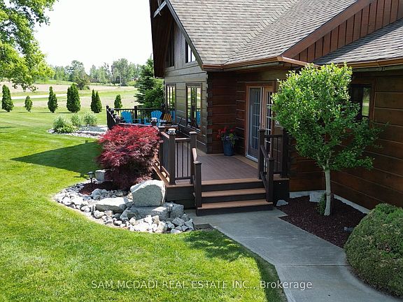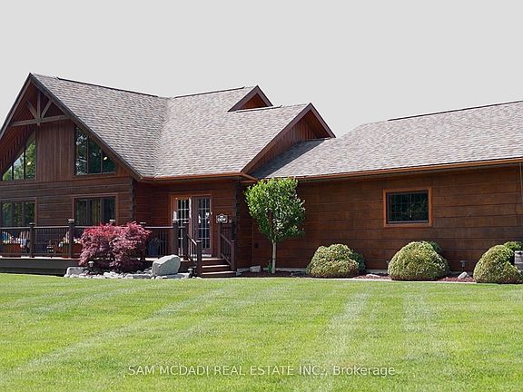 Welcome to this truly one-of-a-kind, custom-built log-style home set on a sprawling private lot - where rustic charm meets modern luxury. Perfectly situated just minutes from Grand Bend, Pinery Provincial Park, and Ipperwash Beach, this property is ideal as a full-time residence, weekend retreat, or investment getaway.Step inside to discover a stunning open-concept design highlighted by soaring 20-ft cathedral ceilings, heated floors on all levels, and abundant natural light. The finished lower level is an entertainer's dream - complete with a spacious recreation area, two additional bedrooms, a custom bar, and a pool table.Enjoy seamless indoor-outdoor living with a 12' x 49' back deck featuring a built-in outdoor kitchen, wood-fired pizza oven, and relaxing hot tub - all overlooking peaceful, tree-lined surroundings. The beautifully landscaped grounds include a decorative rock garden, water fountain, and inviting front porch for morning coffee.Recent upgrades include new windows (2022), dual A/C units for the main floor and loft (2023), and a new boiler (2023). A heated 3,710 sq.ft. workshop offers exceptional space for hobbies, business use, or storage. With both municipal and well water available, this property checks every box for comfort, versatility, and lifestyle appeal.