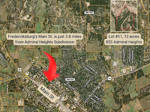 On the edge of Fredericksburg, just 3.8 miles from the city limits, lies the luxury gated subdivision Admiral Heights. This small community of only 16 lots, offers multi million dollar estates, paved roads, underground utilities & protective covenants (guest homes are permitted to be Short Term Rentals). These tracts do not come on the market often. In fact, other than this parcel, there has not been one available since 2021. You will appreciate the care the current owner has taken to clear the majority of cedar while maintaining privacy from neighbors. Native grasses have been re-established & oak trees have been professionally trimmed & managed. Management practices implemented to encourage improved native grasses, retain water & moisture and stop erosion. This 13 acre tract has several options for building sites. You will enjoy the variety of terrain; a large native pasture with long-range views, heavily treed portions & slight elevation changes. This lot is WILDLIFE EXEMPT with very low taxes (just $14.34 in 2024) for a property of this caliber. Whether you are planning to build right away or looking for an investment with low holding costs, this is the perfect tract.