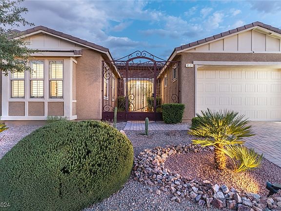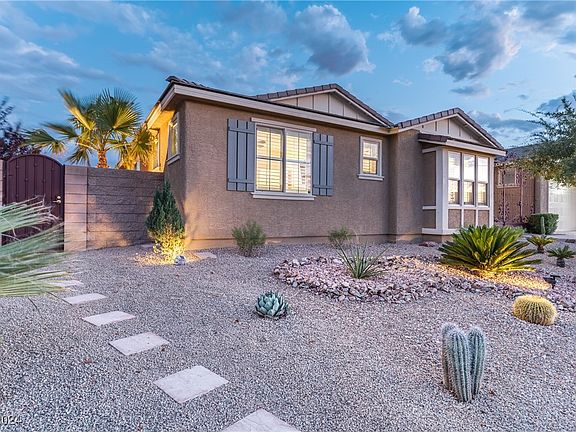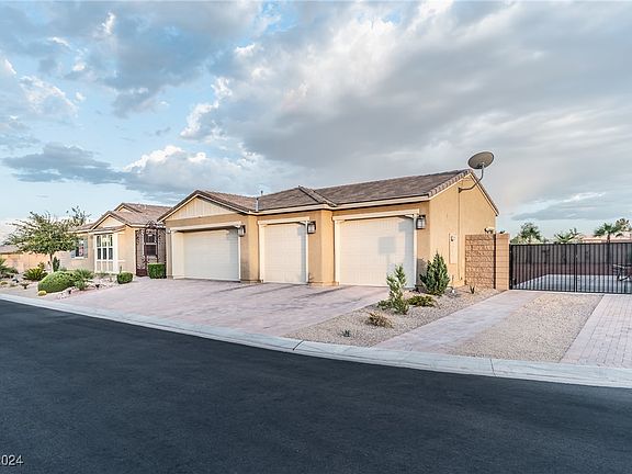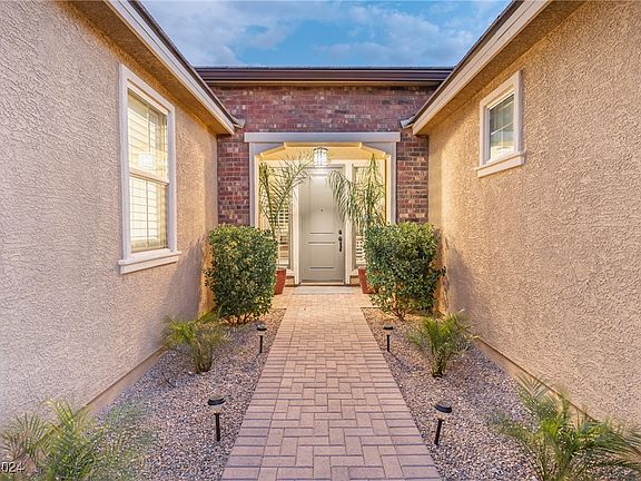 Experience the vibrant allure of Southwest Las Vegas in this stunning single-story home! Boasting 4 bedrooms, an office + 3.5 baths, this sprawling residence sits on a spacious half-acre palm-lined corner lot with over $200,000 in upgrades. Enjoy a rare 4-car garage with drive-through bay, gated RV/Boat parking, & a resort-style backyard with heated saltwater pool, spa, & waterfalls controlled by smartphone app. The outdoor space also features a putting green, sand bunker & fire pit. Inside, discover quality craftsmanship with rustic wood-like tile flooring, a gourmet kitchen with double islands & GE Monogram appliances. Approximately 50 kitchen cabinets + a whole-home water filtration system add to the appeal. Game room with wet bar, custom barn door, wood shutters, smart thermostats & a full home ADT security system with cameras. No neighbors on 2 sides for unparalleled privacy & big desert sky views. Perfect for entertaining, this luxurious home offers chic sophistication & comfort!