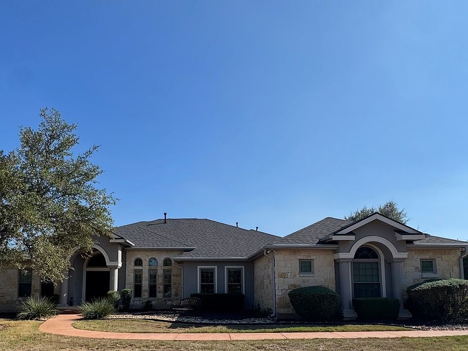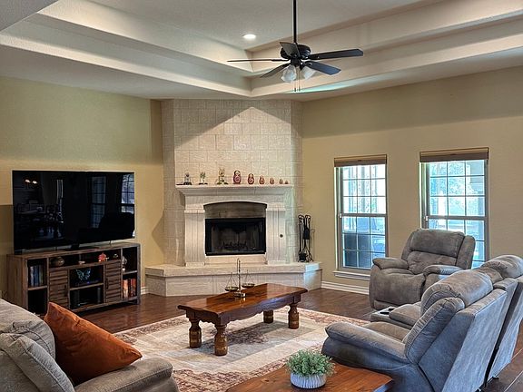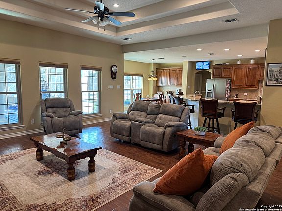 Luxury Living in Garden Ridge. Experience refined elegance in this stunning 3,269 sq. ft. home blending timeless design with modern comfort. Grand entry opens to soaring ceilings, hardwood and ceramic tile floors, with striking gas fireplace. The gourmet kitchen features granite countertops, large island, stainless steel appliances, walk-in pantry, and breakfast area with custom built-ins overlooking the sparkling pool and spacious 3/4-acre backyard. The oversized-primary suite includes a sitting area and spa-style bath with dual vanities, soaking jetted-tub, oversized shower, and large walk-in closet. Enjoy a formal dining room, breakfast nook, private office, and three secondary bedrooms with walk-in closets, one bedroom with full bath is near the side entry garage, the two bedrooms are joined with a Jack-&-Jill bath. Outdoor living impresses with a 22x23 (264 Sq ft) enclosed patio (with AC/heating). Resort-style heated pool is equipped with a waterfall, tanning pool ledge, a hot tub and lush landscaping. Master suite, nook, and one bedroom have an unobstructed view of the pool and backyard. Oversized 3-car garage with epoxy floors and ample outside parking, Generac whole-house generator, a newer roof & one AC, seamless gutters, and sprinkler system. Located in Comal ISD near shopping, dining, and entertainment-this home defines luxury and lifestyle