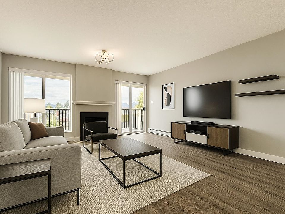 Move straight in and enjoy! Updated throughout; stylish bathrooms, flooring, paint, modern white kitchen, quality appliances and West facing private balcony with sunset mountain views! This spacious home has an expansive living room with n/g fireplace, plus an area for dining or home office. Primary bedroom suite with walk-in closet and it's gorgeous ensuite bathroom. 2nd bedroom (or den or office) and another updated bathroom. This premium 55+ complex offers RV parking, clubhouse, secure bike storage and a workshop, all among impeccably kept gardens. Centrally located for easy access to shops, entertainment and freeway. 2 pets; dogs up to 14" shoulder.