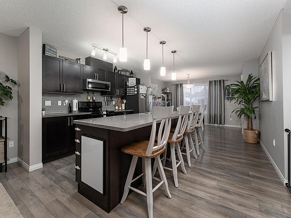 Get ready to fall in love with this bright and stylish 2-storey, 1556 sq ft home in sought-after Edgemont, designed to feel welcoming and open with a layout that supports effortless everyday living. Step inside to warm, contemporary flooring that complements the rich, dark kitchen cabinets, large island, and open-concept main floor, made for hosting and gathering. The spacious living and dining areas feel instantly inviting, with the home’s west-facing exposure flooding them with natural light all day long. Upstairs, enjoy three generous bedrooms, including a gorgeous primary suite with a walk-in closet and full ensuite, plus another full bathroom for family or guests. With 2.5 baths, central air conditioning, and an unfinished basement ready for your personal touch, this home offers room to grow. Outside, the large backyard is perfect for kids, pets, and summer BBQs. All of this is just minutes from the Henday, schools, parks, shopping, and golf; your ideal lifestyle starts right here.