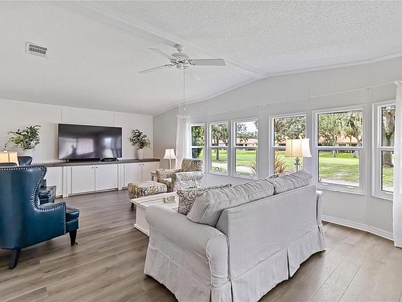 The one you've been waiting for! This beautifully maintained 2-bedroom, 2-bathroom property has everything you’re looking for—plus a few surprises you’ll love. Sitting on a private lot that backs up to the 13th fairway, it’s the perfect spot for enjoying peaceful views and a little extra privacy. Inside, you'll notice details that set a Jacobsen model apart from the others as you’ll find an abundance of thoughtful upgrades. You'll find impact windows in the living room, newer plexiglass windows in the enclosed, under air flex room, and the rest of the windows are updated double-pane windows. Touches like crown molding throughout provides an elegant and finished feel. A new roof and skylights installed in 2021 ensure peace of mind for years to come. The interior is enhanced by vinyl and laminate flooring—no carpet anywhere, plus walk-in closets in both bedrooms and ample built-in storage throughout the home to keep everything organized. Off the spacious dining room and kitchen is a quaint bar with built in cabinetry and bar fridge. The primary bedroom is equipped with a beautiful and updated en suite with the convenience of inside laundry---no sweating folding clothes out in the garage! Even better, there’s an extra 240 square feet of insulated living space with dual-zone AC, ideal for a home office, craft room, or just an extra place to relax. Step outside to enjoy a convenient storage shed, covered parking, and beautiful landscaping that completes the property’s curb appeal. As part of the vibrant community of Imperial Lakes Estates, you’ll have access to fantastic amenities including shuffleboard, pickleball, a pool and spa, clubhouse, and billiard room—plenty of options for recreation and socializing with always something fun to do right outside your front door.