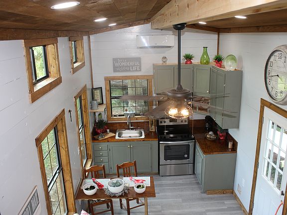 Welcome to Tiny Living! This 10' x 34' Tiny House was built for luxury and no expense was spared, spray foam insulation in walls, ceiling and underneath, tankless on-demand hot water heater, split unit 18,000 BTU AC/Heat unit, designer finishes throughout like a gourmet kitchen with stainless steel appliances, custom built all wood cabinets, gold flake oak countertops, a pull out custom island, pull-out under cabinet drawers, a built in wine glass rack, and a fold down table. Custom details in this home are abundant, 10' ceilings in the living/kitchen/dining room, double pane special order windows, beautiful golden oak stained ceiling, crown molding, baseboards, window trim, and coffered ceiling in bathroom. A large bathroom/laundry room with designer features, stackable washer and dryer, full custom sink, gold metal tile, silver glass tile, silver and gold flake hand painted shower, wine towel rack, economy flush standard size toilet, Delta finishes throughout. The master bedroom is a dream with natural shiplap, walk-in closet, custom built shelving, plug-ins on every wall including the closet and beautiful full windows. The spacious loft is 10' x 17' compatible for two beds and storage. Convenient features on the outside include GFI plug-ins front and back, custom built storage cabinets, sewer connections, electrical connections capabilities. Hook up to this tiny home and you can vacation wherever your heart desires!
