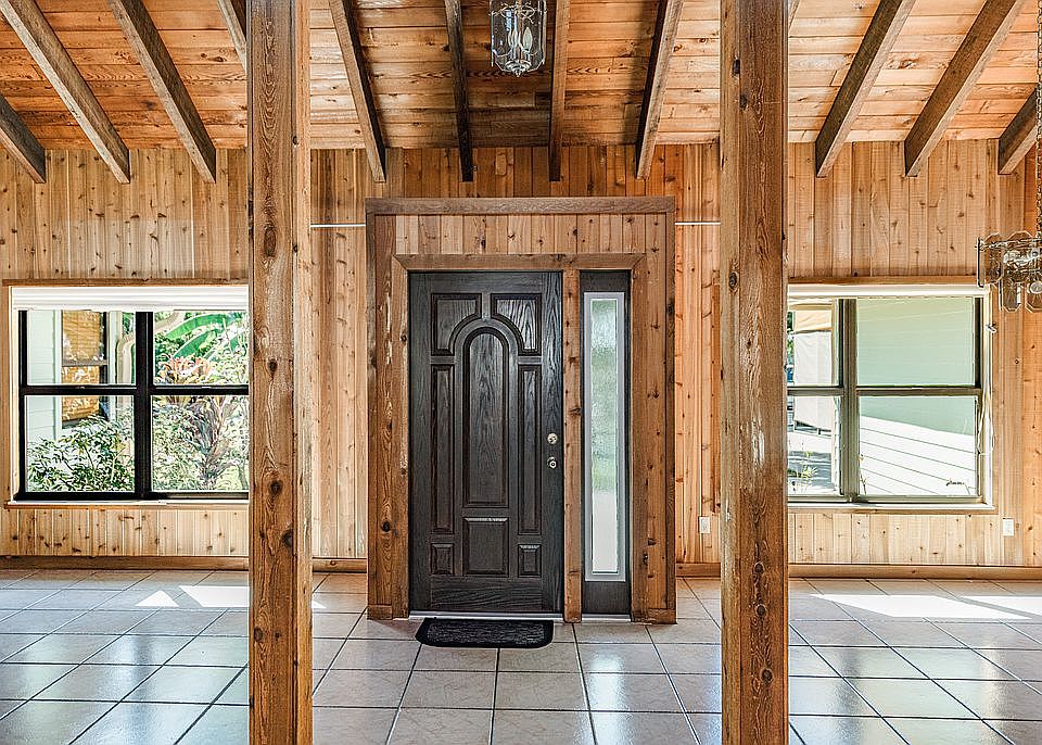 Vaulted ceilings lined with cedar tongue-and-groove and cypress beams create warmth and architectural charm, while natural light fills the home through upgraded hurricane-impact windows. Mostly tiled floors flow throughout, and a large screened porch with skylights, double French doors, and brick accents is accessible from bedrooms on either side—perfect for relaxing or entertaining.