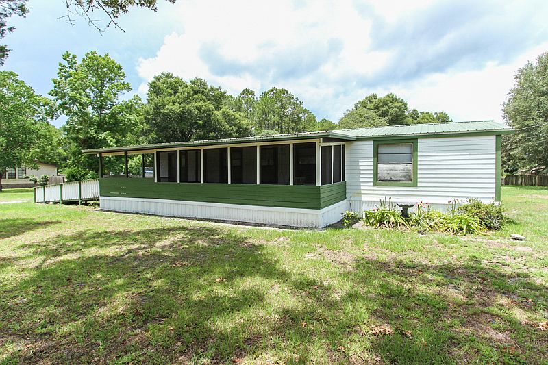 Location Location LOCATION! No HOA! NO CDD Fees! There is plenty of space and privacy for all on this acre of land with private sewage and water. This double wide mobile home features vaulted ceilings, a fireplace in the living room, large open split floor plan, built in corner nook dining set and chandeliers and ceiling fans throughout!! Additional features include a large covered porch, carport and strage building.