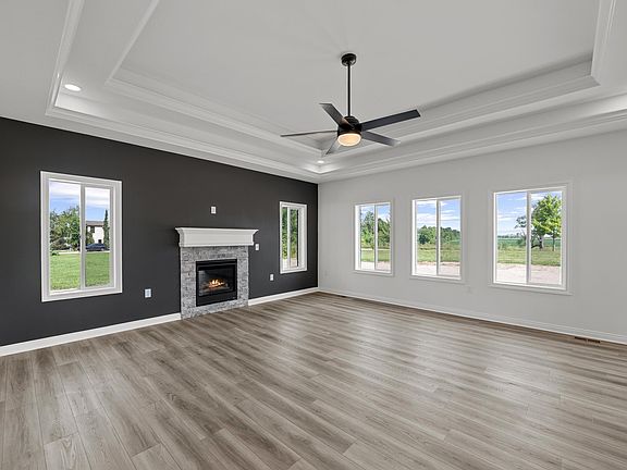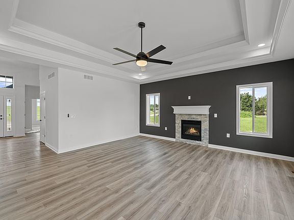 The ''Joshua'' ranch style home w/upgraded 3.5-car attached garage, 9' poured basement w/ exterior waterproofing membrane & egress window, fireplace, bay window, concrete 20x20 patio w/landing & step, 12'x16' cabinet to island, pantry to match existing cabinetry, & upper cabinets in laundry room.