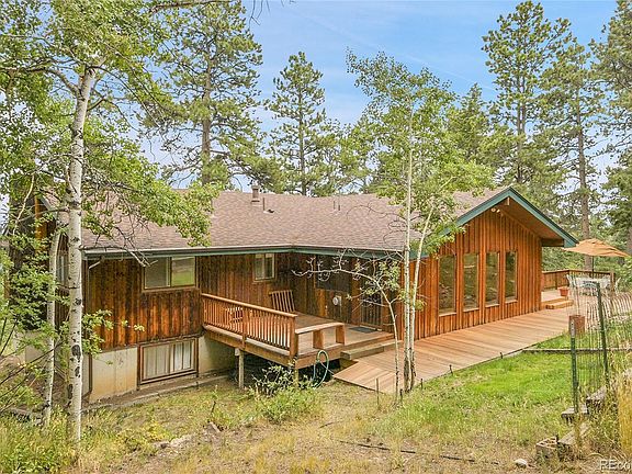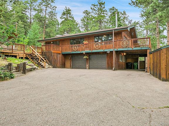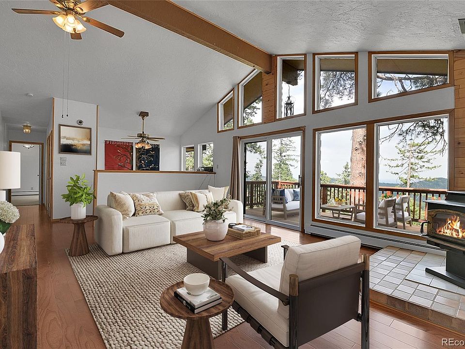 Discover the perfect blend of mountain serenity and urban convenience in this stunning foothills home that captures breathtaking city lights shimmering against the mountain backdrop. This expansive residence welcomes you through a sun-drenched bonus room featuring skylights and an elegant two-way stone fireplace, flowing seamlessly into a generous kitchen equipped with premium stainless steel appliances and an intimate dining nook. The cozy living room centers around a crackling wood stove where you can unwind while gazing at twinkling city lights below, while three distinct living areas ensure everyone has space to relax and gather. The primary suite serves as a true sanctuary with its own charming sunroom and luxurious full bathroom featuring sophisticated slate tile surroundings and a deep soaking tub, complemented by two additional well-appointed bedrooms—one on the main level and another on the walk-out lower level with its own private bathroom. The lower level family room opens directly outdoors for seamless indoor-outdoor living, while wraparound decking on three sides creates multiple outdoor spaces perfect for observing wildlife and soaking in spectacular views. Ideally positioned just 10 minutes from both C-470 and charming Conifer, this property offers the rare combination of mountain tranquility and easy access to urban amenities, where every day feels like a vacation in the best of Colorado living.