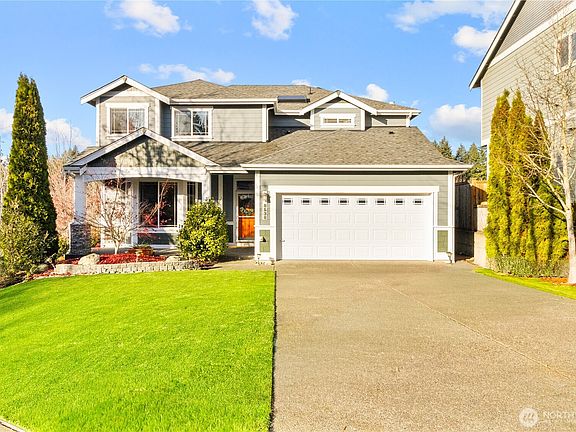 Elegantly upgraded 4 bed Rob Rice home in coveted Evergreen Heights. This single-owner, beautifully maintained residence features a fully remodeled spa-like primary suite with standalone soaking tub, tiled walk-in shower, quartz counters, and custom closet. Updated kitchen offers quartz counters, tile backsplash, pendant lighting, stainless range hood and single basin sink. Extended hardwood floors flow through main level, loft, and primary suite. Spacious skylit loft & large secondary bedrooms offer versatility. Corner lot with low-maintenance turf yard, fully fenced, pergola, plus heat pump A/C! Prime location near JBLM, parks, shopping and walking distance to elementary school. This one is in even better in person-don't miss it!
