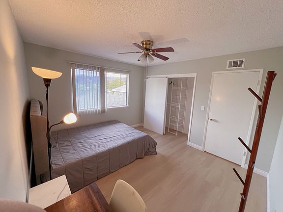 Private furnished room (160 sq ft) with bed, mattress, desk, chair, closet, and a new ceiling fan.
