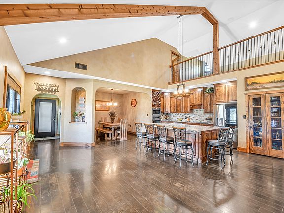 Retreat to the private primary suite with a spa like bathroom, rain showerhead, water jets, wand, and oversized soaking tub for ultimate relaxation. Upstairs, the loft includes a media sitting area with built ins and two large bedrooms. The property also includes a 1,200 sqft insulated workshop complete with a kitchen, full bath, and washer dryer connections; ideal for hobbies or guest stays.