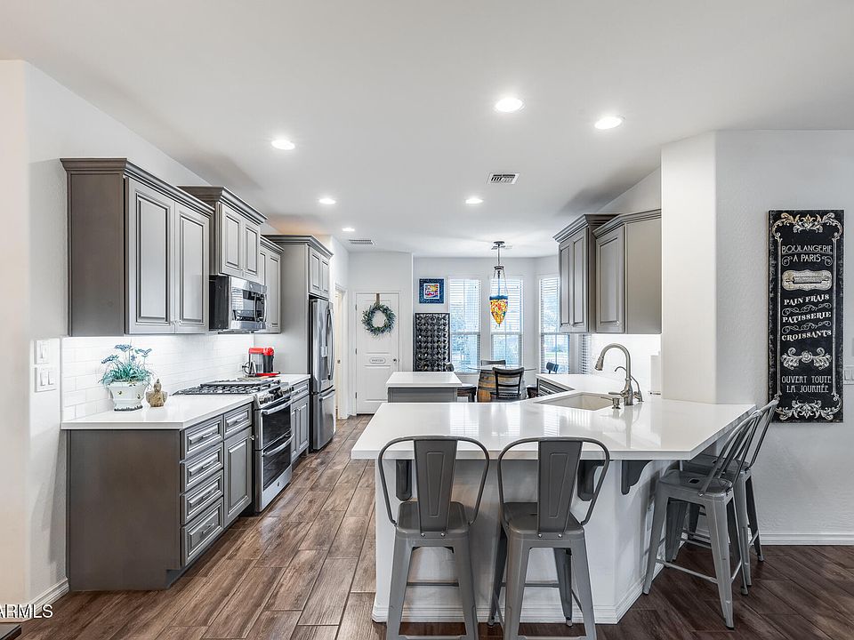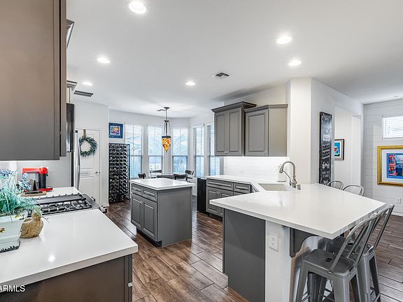 Resort-Style Living! Located in the sought-after community of Encanterra, this home features an open floor plan with wood-like ceramic tile. The kitchen shows off white quartz counters, subway tile backsplash, center island, SS appliances, breakfast bar & walk-in pantry, plus eat-in area surrounded by windows for natural light. Primary suite offers an ensuite with large vanity, toilet room & walk-in shower. A versatile den/office provides the perfect extra space. Backyard features a covered patio with mounted smart TV, ceiling fan & endless potential. Encanterra provides a lifestyle unlike anywhere else in Arizona—lush greenery, amenities including playgrounds, tennis & pickleball courts, pools/spas, golf course, guarded gate, etc. & resort-style living that feels like vacation every day!