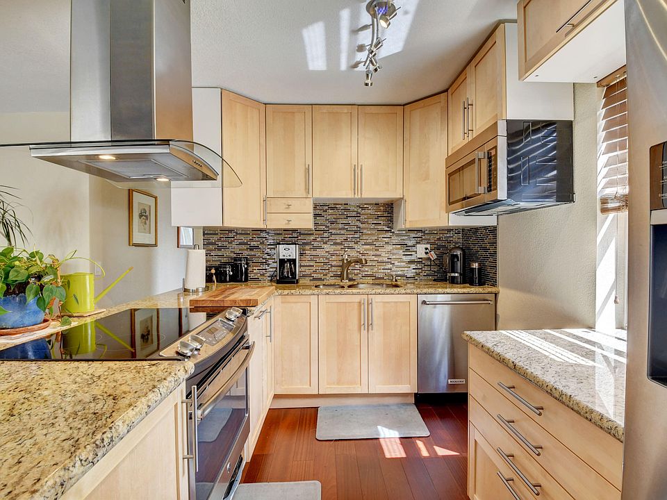 Unlike anything else in Kings Point Golf and Country Club(55+), this second-floor condo used to be a two-bedroom but is now a unique, beautifully renovated one-bedroom with two full bathrooms. The kitchen is fully updated, including newer appliances, granite countertops, laminate floors, and ample storage space. The bright, open-concept bedroom opens to the covered balcony that overlooks garden space. The primary bathroom is truly one of a kind. It includes a dreamy oversized walk-in shower with tumbled marble and is complete with a rain showerhead. It also has porcelain floors and marble countertops. The second bathroom has a jacuzzi tub with tumbled marble. Kings Point is the place to be, with three clubhouses, two golf courses, multiple outdoor pools, restaurants, and more!