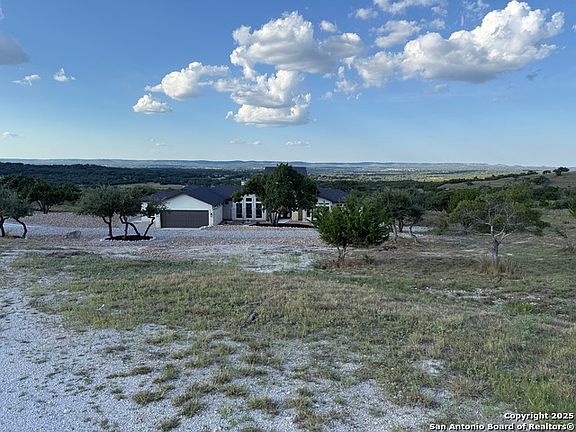 Spectacular Hill Country Views in a awesome hill country setting. Nestled in the heart of Texas Hill Country, this custom dream home is perched on a sprawling five-acre lot in Majestic Hills Ranch, offering spectacular panoramic views in every direction. Boasting 4 bedroom 2 bath, 2,400 square feet of thoughtfully designed living space, this residence is a rare blend of modern luxury and natural beauty. Step inside to discover soaring ceilings, modern fixtures, and striking architecture that create a bright and welcoming ambiance. Hard surface flooring over the entire home ensure easy maintenance, while expansive, tinted windows bathe the interiors in natural light and showcase the stunning scenery. The open-concept kitchen, complete with a large island, ample cabinetry and counter space, flows seamlessly into a spacious living area anchored by a cozy fireplace-perfect for gatherings or quiet evenings. Owner's Retreat and Flexible Spaces The owner's suite serves as a private sanctuary, featuring a garden tub, walk-in shower, dual sinks, and a generous walk-in closet. Additional highlights include a dedicated study, a versatile gym or bonus room, and a well-equipped laundry area with cabinetry, countertops, and a sink. Outdoor Living and Community Amenities Enjoy tranquil sunrises from the covered patio, complete with an impressive outdoor fireplace. The oversized two-car garage provides abundant storage, and the acreage community guarantees both privacy and convenience. The partially fenced land comes with wildlife exemptions and free-roaming exotics, offering scenic beauty throughout the community. As Blanco is a designated dark sky community, residents can revel in endless starlit nights. Community amenities abound, including a homestead residence available for short-term rental to residents and their guests, a scenic park with a spring-fed creek and watering hole, a barbecue area, meeting apartment, and sports courts. The location offers no city taxes and convenient access to the Blanco River, Texas Wine Trail, and both Austin and San Antonio airports. Experience the local charm with live music venues, eateries, and the beloved Blanco Lavender Festival. Majestic Hills Ranch Lifestyle Residents enjoy a secure, gated entrance, a park with a spring-fed swimming hole, a sports court, and a welcoming community room. The Homestead House offers overnight accommodations for guests, while community events foster neighborly connections. ATV-friendly roads encourage social activities such as book clubs, barbecues, and sunset rides.