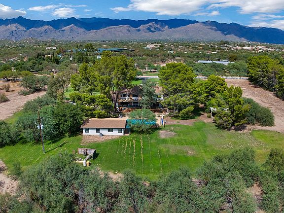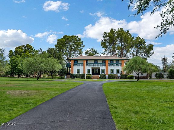 Amazing opportunity to own a truly unique/remodeled home w/guest house & pool in coveted Tanque Verde Country Estates. Arrive via a tree-lined Woodland Rd, down a long/circular driveway, to this warm but stately two story wrapped in porches with sweeping mountain views. The property spans 7.7 horse friendly acres w/private well, grandfathered irrigation rights, direct access to Tanque Verde wash, room for livestock, RV/ rec toys- all with no HOA. Main home offers 5954 sq ft w/a flowing floor plan, six bedrooms (one downstairs) & five bathrooms, high ceilings, maple wood floors, wood beamed ceilings, two double sided sump block fireplaces, immense cabinetry & storage, three car garage. Kitchen features granite countertops, a porcelain stone floor, butcher block island, stainless appliances A covered patio off the dining room and kitchen invites outdoor entertaining, complemented by wraparound porches with stunning views, and spacious lawns. Step outside past the sparking pool to the guest house, a charming 873 sq ft casita with one bedroom, one bathroom, full kitchen, high ceilings & Saltillo tile throughout. Nearby, a sport court with adjustable basketball hoop offers additional recreation. This property truly has it all- serene country living just minutes from groceries, restaurants and all the conveniences of town.