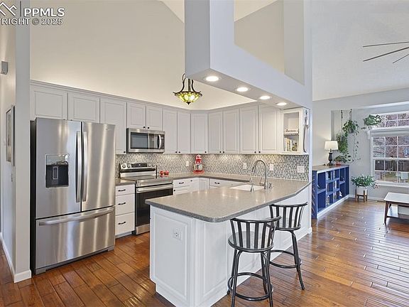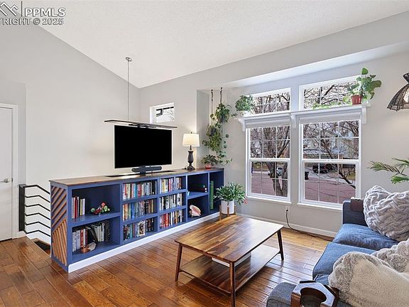 Welcome home to this beautifully cared for home, thoughtfully enhanced with stylish upgrades. Step inside to find newer installed hardwood flooring that flows through the main-level living, dining, and kitchen areas. A custom built-in bookshelf and TV cabinet with the included TV on an automated lift system adds both function and flair. The striking staircase features wood treads, elegant iron railing, and tasteful tile accents, setting the tone for the quality finishes found throughout the home. The updated primary bathroom feels like a private retreat, offering a new glass shower enclosure, beautiful tile accents, and custom tile feature walls. The kitchen provides abundant cabinet space, a tile backsplash, and a convenient hot water tap perfect for your morning tea. The lower level is equally impressive, showcasing a cozy gas-burning fireplace with an electric blower, a spacious laundry area with an included washer and gas dryer, and two generously sized bedrooms, each upgraded with custom built-in closet systems. Outdoor living shines with a composite deck with iron railing and a lower patio ideal for entertaining. The backyard features irrigated garden boxes, a storage shed, and the most charming bonus, a chicken coop complete with chickens. The attached garage offers additional functionality with a workbench, cabinet storage, and built-in shelving perfect for tools, hobbies, or organization. Located in the sought-after Academy District 20, this home offers easy access to top-rated schools, parks, walking trails, shopping, and dining. Commuting is a breeze with close proximity to I-25, Peterson Space Force Base, and a short drive to the U.S. Air Force Academy. Additional highlights include new exterior stucco, newer roof, newer water heater, and much more. Lovingly maintained by its current owners, this home is move-in ready and waiting to be cherished by the next. You’ll fall in love with all the thoughtful touches that make it truly special.