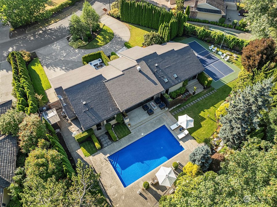 Welcome to your dream oasis in Hunts Point! This fabulous turnkey rambler has been reimagined for fun, sophistication & relaxation. The backyard is a private paradise w/ a dreamy pool & highly sought after pickleball court. Step inside to a glamorous, open-concept retreat, with an incredible pedigree of luxury materials designed to celebrate your best life. Top-of-the-line Sub-Zero, Viking & Miele appliances surrounded by book matched Calacatta Gold marble, walnut cabinetry & a surprise caterer's kitchen! Custom double-sided steel fireplace. A La Cantina door wall invites indoor/outdoor summer living. Primary suite w/ private patio & soaking tub. Every day is a rejuvenating escape. A work of art in one of the most cherished neighborhoods.