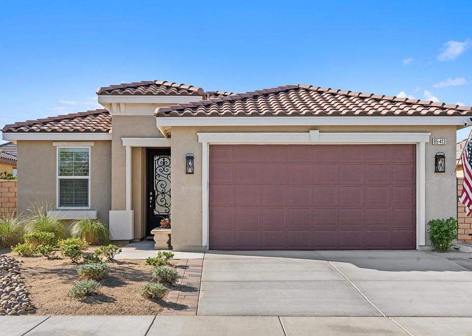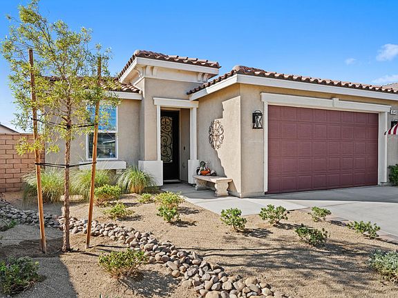 Charming and meticulously maintained 2-bedroom PLUS DEN, 2-bath home (1,555 SF). From the moment you enter through the custom iron front door, it's clear no detail has been overlooked. The welcoming foyer opens to a bright great room with abundant natural light, enhanced by plantation shutters throughout and a cozy gas fireplace that sets a relaxing tone. Beautiful tile flooring flows through the main living areas, creating a sense of calm and cohesion. The kitchen features stylish cabinetry, slab granite countertops, and a generous pantry, making it both functional and inviting. Step outside through sliding glass doors to a private backyard with stunning south and southwest mountain views and amazing sunsets. The wrought iron rear fence preserves the view of the desert landscape for uninterrupted vistas. The backyard has hookups to accommodate a spa. The spacious primary suite offers large windows framing breathtaking views. Inside the primary bath are dual vanities, and a large walk-in closet. A secondary bedroom and full bath are thoughtfully located down a private hallway, providing comfort and privacy for guests. The den provides ample space to be used as a formal dining room, office or potential third bedroom. Solar panels/solar shades provide extra energy efficiency.Welcome to Four Seasons at Terra Lago--an active 55+ resort-style community offering a beautifully designed clubhouse with social spaces, a modern fitness center, indoor/outdoor pools, tennis, basketball and bocce courts, a library, craft room, and clubs ranging from book discussions to watercolor painting. Whether you seek adventure, wellness, or connection, this vibrant community offers it all--just minutes from dining, shopping, and entertainment at Fantasy Springs Resort and Spotlight 29 Casino.