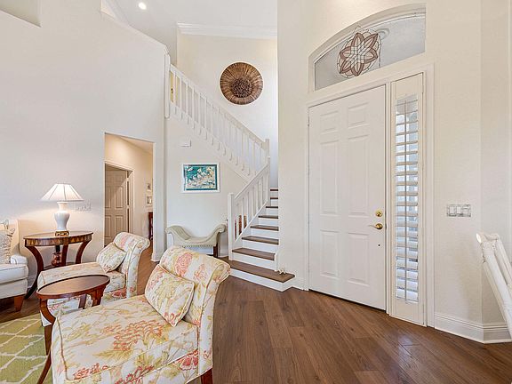 Great location in Fiddler's Creek, this charming single-family home located in Pepper Tree is minutes from the main Entrance as well as the world-class Club, Spa, and Fitness Center. Ideally situated with a stunning lake view, this exceptional two-story home includes 4 Bedrooms, 3 Baths and the warm feeling that embraces the essence of South Florida living. One of only 5 homes with this unique floor plan, the expansive combination living and dining area is roomy and open, drawing you into the open vaulted ceilings and the additional jack and jill guest bedrooms of the 2nd floor. A spacious family room and an open kitchen create a bright environment that rivals only the sun-drenched patio of the back lanai. Two-story high ceilings with crown moldings enhance this newly painted, delightful home. The recently remodeled kitchen and lighting throughout are also special features. The extra-large outdoor space is fully screened with room for a full-sized pool and spa. The 4th bedroom, on the main level with a full bath, can efficiently serve as an office or den. Across the hall, the primary bedroom suite opens to the rear lanai and includes two walk-in closets. The master bath with dual sink, separate shower, and garden bath is roomy and bright. Stunning new wood flooring adds to the home's comfortable and sophisticated feel. Additional features of this exceptional home include a remodeled laundry room, central vacuum system, and a 10-year transferable warranty for the A/C. The refinished garage floor, overhead enclosed cabinetry, extra-wide driveway, and plantation shutter window treatments show attention to detail. Fiddler's Creek is an amenity-rich country club environment with a full-service spa, fitness and wellness center: Pickle Ball, Bocce Ball, Tennis, and more. A full-time recreation director and two exceptional restaurants complete the picture of luxurious living, close to everything South Florida has to offer.