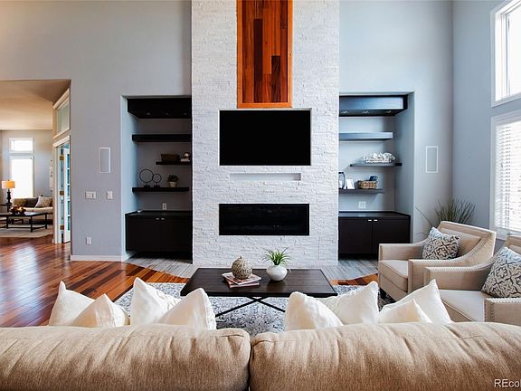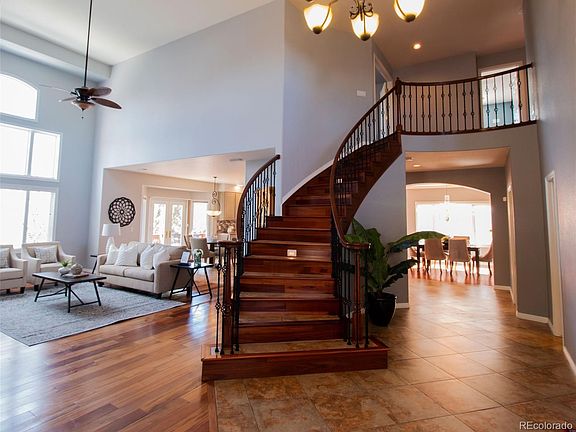 Gorgeous large 5-bedroom home nestled in the Fairways neighborhood with an amazing open plan layout, welcoming you and your guests with an impressive 2-story grand entrance, a custom curved staircase, and lots of natural light. The house has been upgraded to include solid hardwood (tigerwood) floors throughout the main and upper level and tile floors in the kitchen and bathrooms. The stunning family room has a floor-to-ceiling fireplace surrounded with beautiful Quartz tiles with custom built-in cabinets and shelving. The expansive kitchen features high quality newer stainless-steel appliances, two pantries, tons of kitchen cabinets, granite countertops, and a large island. Leading off the kitchen to the large deck, you are surrounded by large mature trees providing complete privacy, leading to open space and path to the Lone Tree Golf Club. The fully finished walkout basement includes 2 entertainment areas, wet bar with fridge and dishwasher, bedroom, library, and an amazing workshop. Outside is very low maintenance with a 3-hole putting green and large stamped concrete area to help you relax in front of the fire pit with your favorite beverage. Under the deck, it is prewired 220V for your hot tub and a natural gas hook up for your grill. The house is ideal for large families and entertaining. The property has had a new roof less than 4 years ago. Seller has purchased a home warranty that can be transferred to the buyers at closing