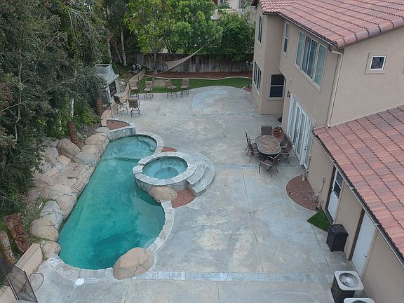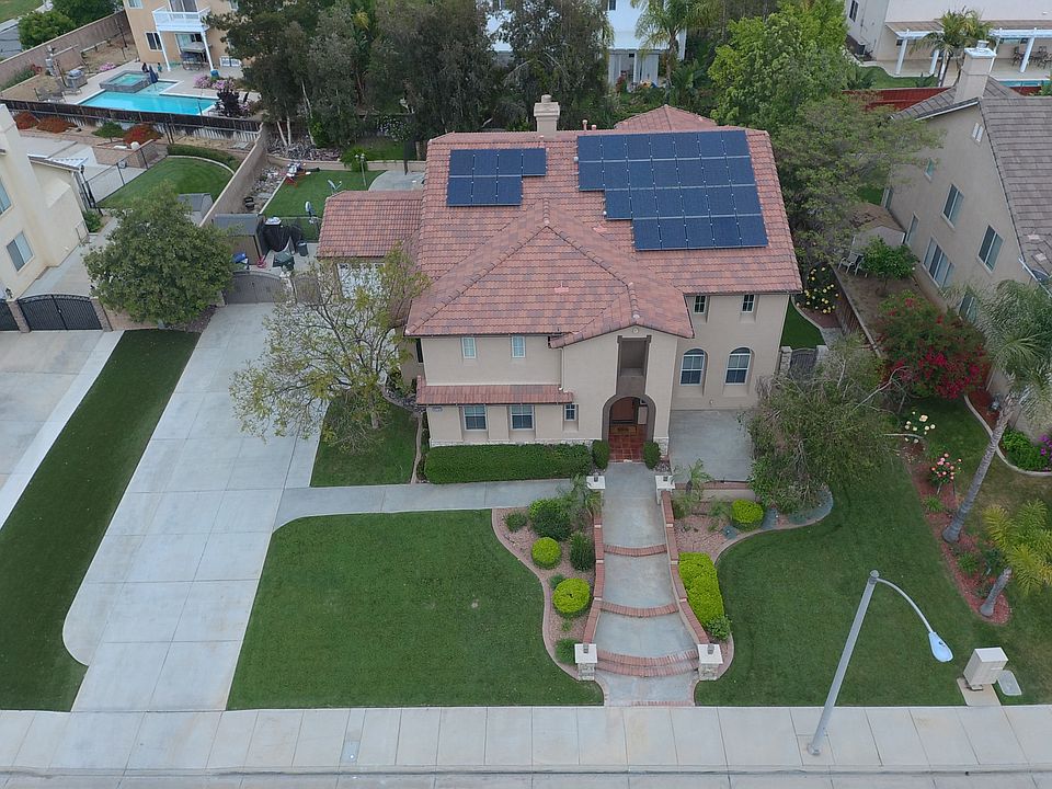 Highly sought-after Steven Walker executive home in Orangecrest Country. Enter this beautiful home & immediately fall in love. From the Open, airy feeling of the cathedral ceilings to a fun outdoor entertaining space, you'll build lasting memories. Boasting Plantation shutters, hardwood flooring, luxury carpet, crown moulding, upgraded fans & granite throughout. In-law Suite Bedroom with adjacent bathroom downstairs. Separate guest powder bath has a pedestal sink. Formal living & dining room. Kitchen with bar height granite counters & tumbled stone backsplash opens to the large family room with built-in entertainment center & fireplace with matching custom wood mantle. Kitchen includes stainless appliances with double convection ovens, butler area & a walk-in pantry. Large Laundry room has built-in storage & counter with sink. Walk up the curved staircase to the Master suite with fireplace and generous closet and ensuite bath with separate deep soak tub, his & her sinks & tiled shower. There are 3 additional bedrooms, a shared bathroom & a bonus room upstairs. Enter the backyard with swimming pool, spa, fireplace & horseshoe pit. Removable, pool safety fence included. Separate 2 bay & 1 bay garages. Room for secure, gated side parking available. All powered by owned, 7.84kWh PV Solar Panels to dramatically reduce electric bills. Within walking distance to top-ranked JF Kennedy Elementary School. Also zoned for highly acclaimed ML King High School. Low Taxes and HOA.