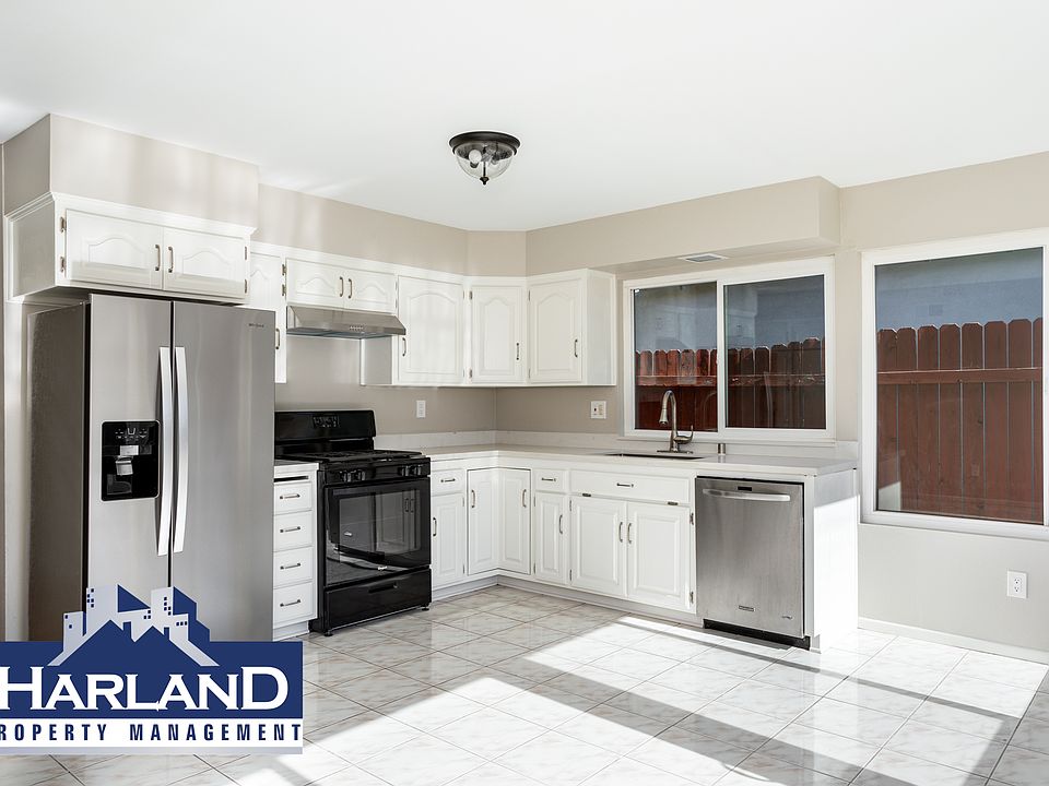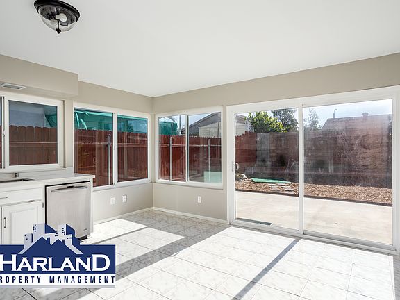 Large yardWhite cabinetryQuartz countertopsStainless steel refrigeratorVinyl plankSliding glass doorsNatural lighting