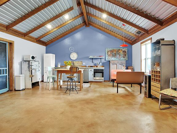 This one-of-a-kind barndominium blends rugged Texas charm with vibrant artistic flair, set on 3 fully fenced acres. The spacious open-concept layout features vaulted metal ceilings with exposed beams, polished concrete floors, and rich wood accents throughout. A cozy wood-burning stove anchors the living area, while Western-inspired décor, sliding barn doors, and colorful original art add character and warmth.