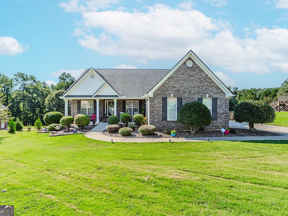 Well-maintained 4-sided brick ranch with a full, unfinished basement on 1.3 acres. Home offers 3 bedrooms, 2 full baths, and an open floor plan with high ceilings. Hardwood floors throughout main living areas. Spacious family room with fireplace and adjoining sunroom. Kitchen features white cabinetry and a breakfast area. Separate dining area. Master on main with tray ceiling, walk-in closet, dual vanities, separate tub and shower, and private water closet. Secondary bedrooms are spacious with ample closet space. Laundry room on main. Basement is full size, unfinished, and studded for bath. Exterior features include covered front porch, back deck and patio, storage shed, and large open backyard with creek at rear of property. Solar panels installed. Peach tree in front yard. Quiet, established neighborhood. Built in 2003. Septic system.