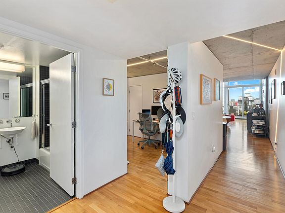 HIGH-END UPGRADES: Custom electric roller shades, gorgeous hardwood floors, custom Trapeze lighting in master and guest bedrooms, living room & dining room, under-mounted kitchen counter lighting, upgraded industrial stair covers, walk-in California Closets, freshly painted & W/D. Gourmet stainless steel and granite kitchen, with a new refrigerator. Quality concrete construction and fiber optics. Deeded indoor parking spot!