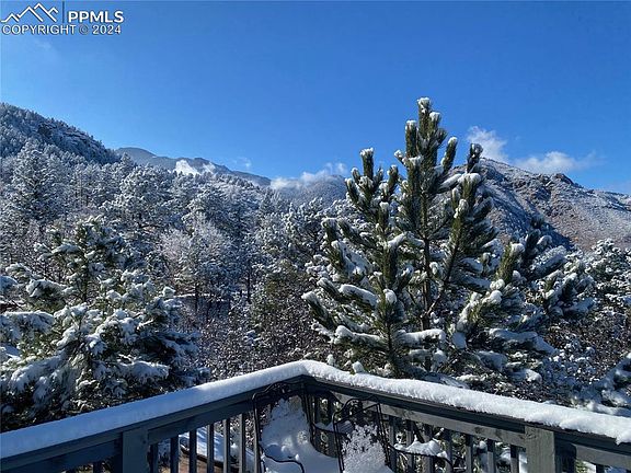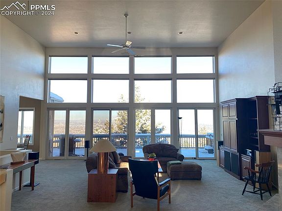 Remarkable setting with VIEWS BEYOND WORDS! When we say ROOMS WITH A VIEW, WE REALLY MEAN IT! Gorgeous custom contemporary home located at the TOP of Skyway close to national forest and Bear Creek Park with endless trails out your door. The views of Garden of the Gods, twinkling city lights and the mountains are embracing you from most every room. The ranch floor plan is ideal for main level living. The entrance walks you into the GRAND great room showcasing the views with windows 2 stories high across the entire back of the house. Kitchen has a modern style that is timeless with subzero, Viking 6 burner range, a big island you can pull up your bar stools and a cozy eat in kitchen dining area. From both rooms you walk out to the wrap around trex deck to enjoy your outdoor living spaces. Dining area is separate yet still open. Primary en suite on main level has high vaulted ceilings, fireplace and 6 pc bath with a pass thru to a lovely office/den/nursery room with a fireplace. You do also have a private entrance to this room as well. Large laundry room with built in utility sink, coat closet and good storage with access to the garage. Big 3 car with 8ft doors that were upgraded recently. Upper level loft with built in desk overlooking the great room. You can still enjoy the views from the inviting lower level which is a walk out with an additional deck and entertaining area. Spacious family/rec room with lots of options to have your movie nights and room for your pool table or any other favorite gaming table. The lower level has an additional primary en suite on one side with 2 other good size bedrooms opposite the family room. Timeless design, wide staircases, Paella windows, 3 fireplaces, 2 furnaces, 2 acs and 2 water heaters. Solar roof panels offer and energy efficient system. This home has only had 2 owners in its life time, that says alot about how amazing this unique home is. Buyer to verify sq footage. Den/office is an addition.