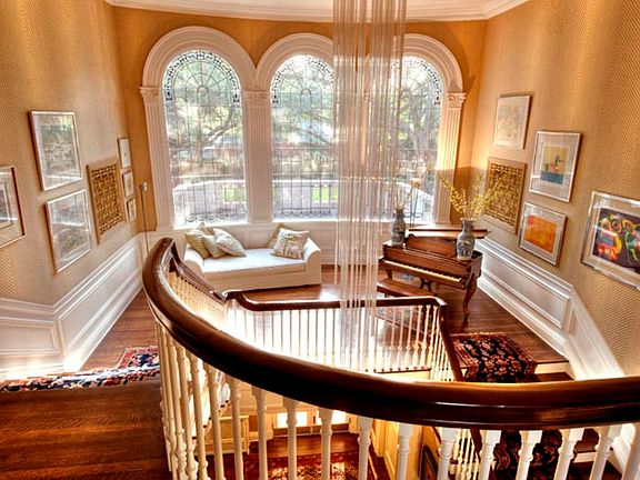 molding and millwork and soaring ceilings embellished with incredible decorative details and large landing with gorgeous arched windows. Beautiful