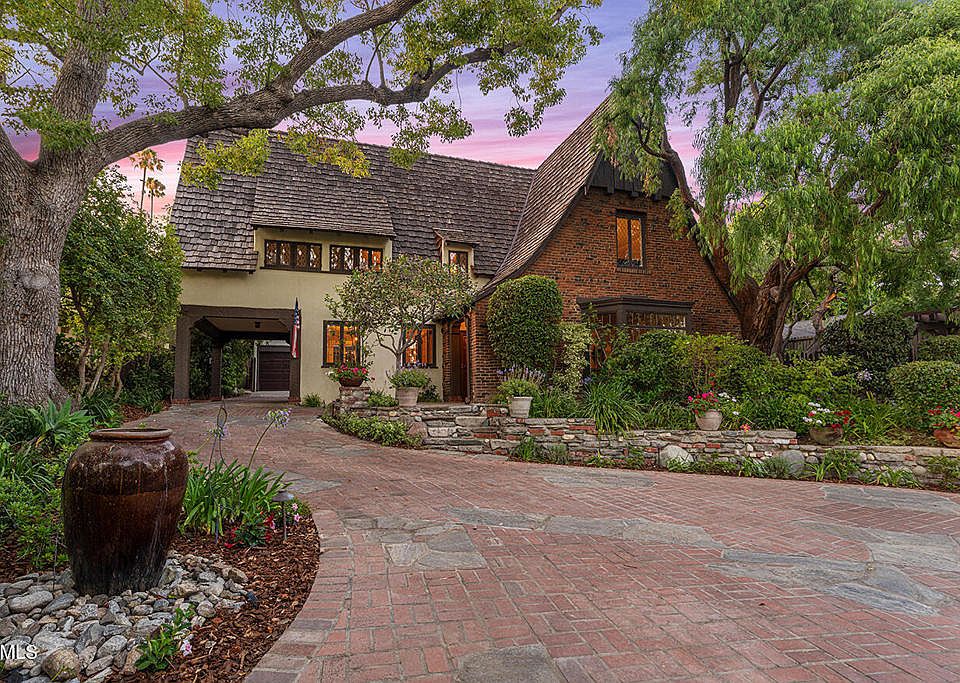 Nestled within the prestigious Oak Knoll neighborhood behind a private gate, this enchanting English Revival, designed by noted architect H. Denman Schutt, located near the renowned Langham Hotel, offers a rare blend of timeless elegance and tranquil seclusion. A storybook front garden, adorned with flagstone and vintage brick pathways, lush greenery, and a serene vase fountain, leads to a welcoming covered porch and gracious entryway. The step-down formal living room showcases gleaming peg-and-groove flooring, while a handsome fireplace, flanked by French doors, opens to a central courtyard where the gentle sound of a Batchelder-style tiled fountain creates a serene retreat. The striking leaded-glass bay window frames the idyllic views of the manicured front garden. Discreetly tucked behind a bookshelf lies a whimsical speakeasy-style bar, a nostalgic nod to a bygone era that adds a playful touch to the room's grandeur. The formal dining room is elevated by exquisite leaded windows and doors; intricate moldings, a parquet floor with inlaid 'wood rug' design and the French doors open to a romantic Porte Cochere. Adjacent is the open gourmet kitchen featuring a generous soapstone island, premium stainless steel appliances, custom cabinetry, and a sunlit breakfast nook with a view of the lush rear garden and the natural, green pool that blends in like a pond. Just off the kitchen, an intimate sitting area with a second fireplace and French doors offer seamless access to the courtyard and an inviting pathway to the enclosed pool and spa--perfect for effortless indoor-outdoor living. A stylish powder room completes the main level. Upstairs, two private suites and a spacious third bedroom offer both comfort and versatility. The front suite features an entire wall of built-in shelving and cabinetry, along with vintage leaded windows. The rear suite includes dual walk-in closets and a charming ensuite bath with double vanities and a dual-head shower. A large hall bath servicing the third bedroom features a classic pedestal sink and soaking tub, plus a convenient laundry closet, round out the upper level. The detached two-car garage is topped by a versatile bonus room--ideal as a home office or gym. Additional highlights include rich wood flooring throughout, fresh interior paint, and upgraded attic insulation. Framed by romantic gardens, meandering walkways, multiple fountains, and a whimsical pond, this magical home is ready to welcome its next fortun