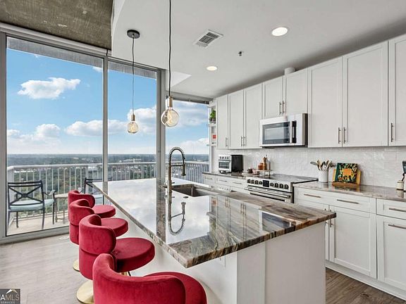 Enjoy breathtaking 180+ degree views from this remarkable 30th floor corner unit at Viewpoint Condominiums. This two-bedroom residence offers both sweeping eastern views of Midtown's historic residential district, Piedmont Park, Emory, and Stone Mountain, as well as northern skyline views of Midtown to Buckhead that sparkle at night. The home features two private bedrooms with generous storage, a spacious primary suite with double vanities, an oversized tub/shower combo, and a large walk-in closet outfitted with a custom closet system. A recently renovated kitchen with modern appliances, quartzite countertops, and sleek cabinetry complements the LVP flooring throughout. Additional highlights include a full-size stackable front-load laundry and two deeded covered parking spaces in the secure garage. Residents enjoy a clean, quiet building with excellent neighbors, an exceptionally well-run HOA, a 24/7 concierge, pool deck, clubhouse, gym, garden level with grilling areas, and a screening room. The unbeatable Midtown location places you steps from Piedmont Park, the Fox Theatre, the High Museum, MARTA, restaurants, shopping, and nightlife.